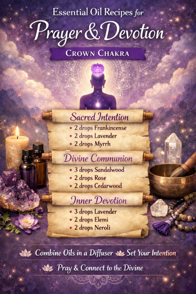 This blend supports the Crown Chakra, the center of higher awareness, spiritual devotion, and inner alignment.